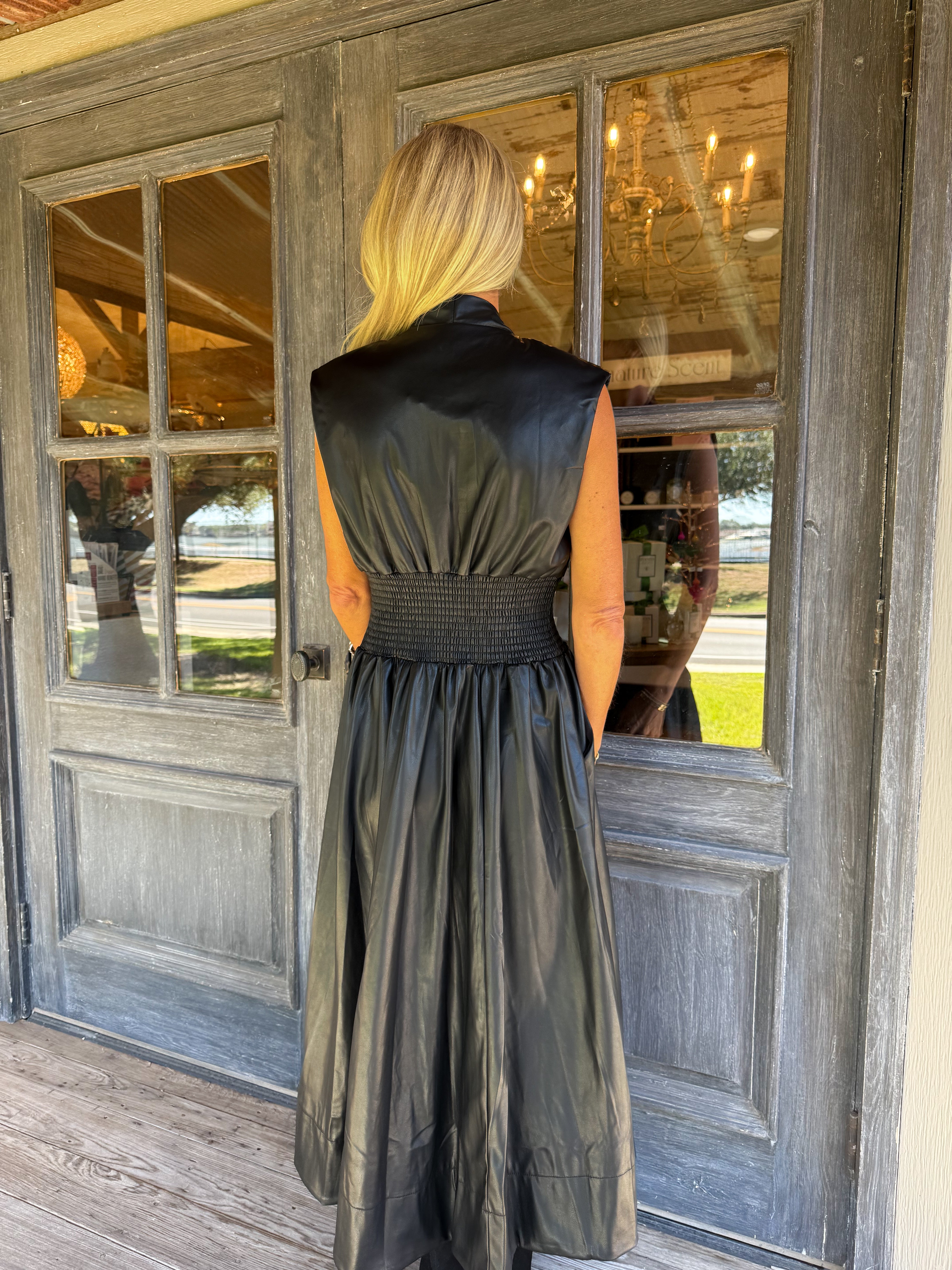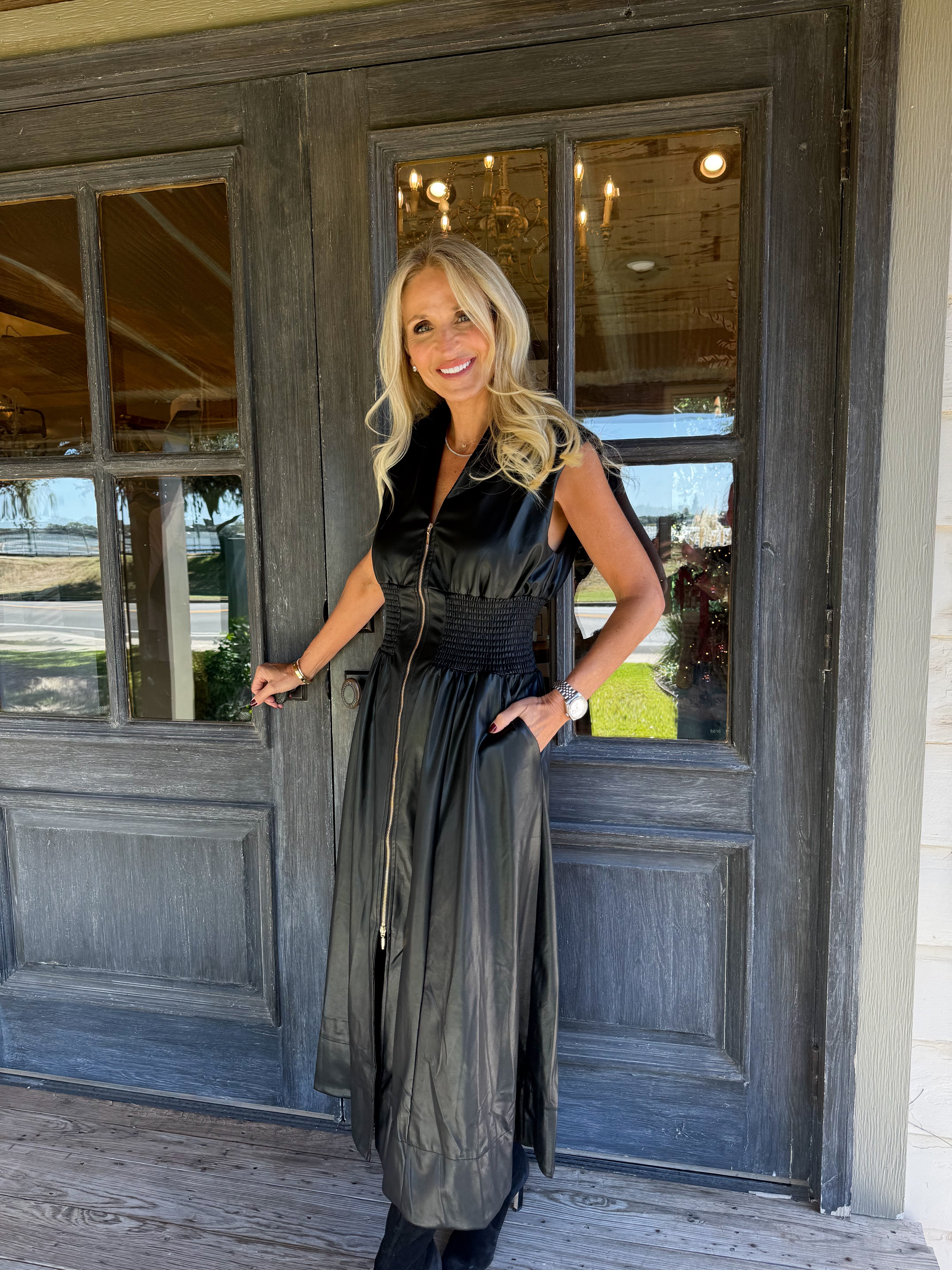 Embrace your inner rebel with our Trinity Midi Dress! This black faux leather dress features a smocked waist, zip front, and midi length for a sleek and sexy look. Perfect for anyone who wants to feel like they belong in The Matrix (without the bullet dodging).