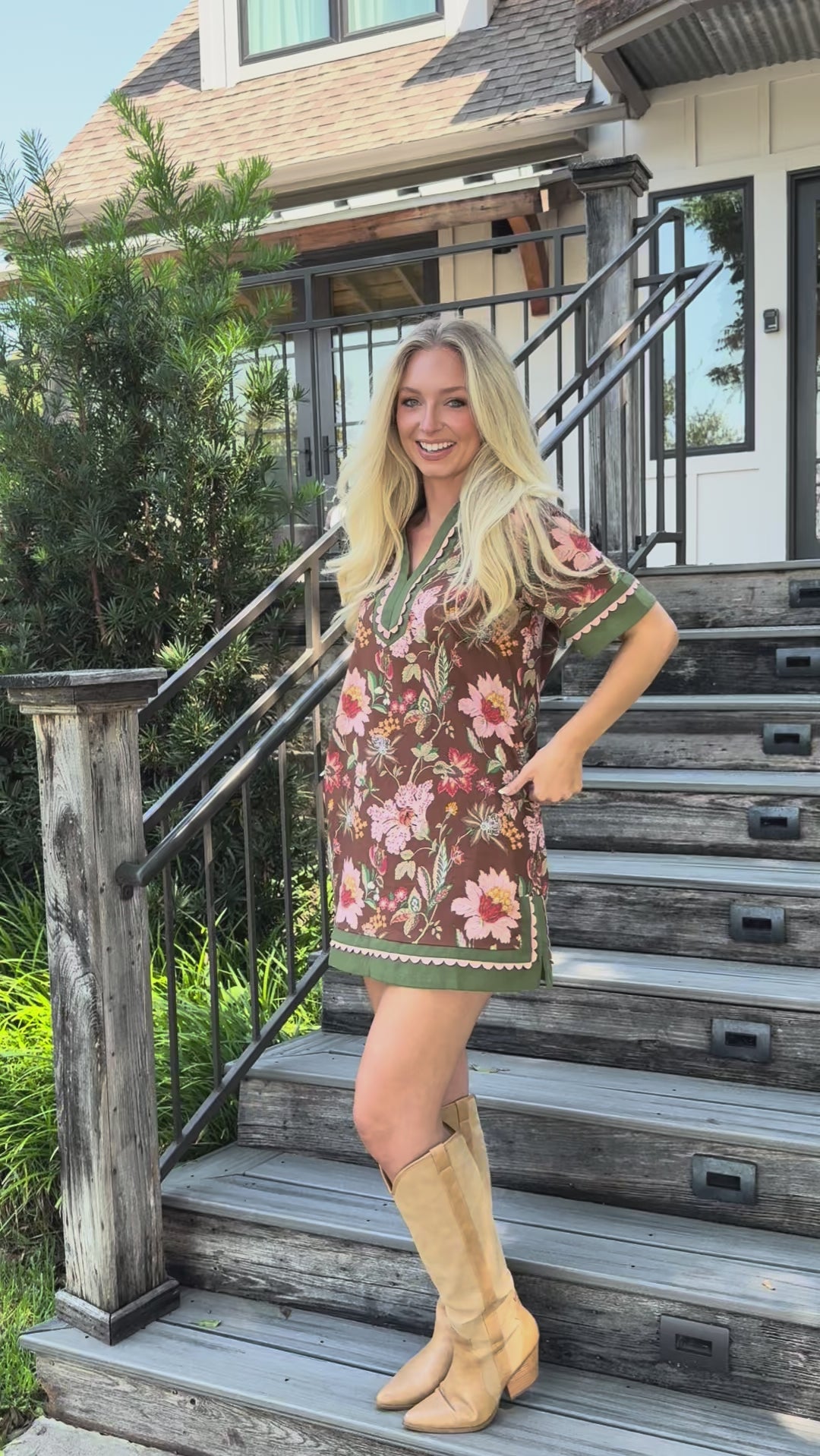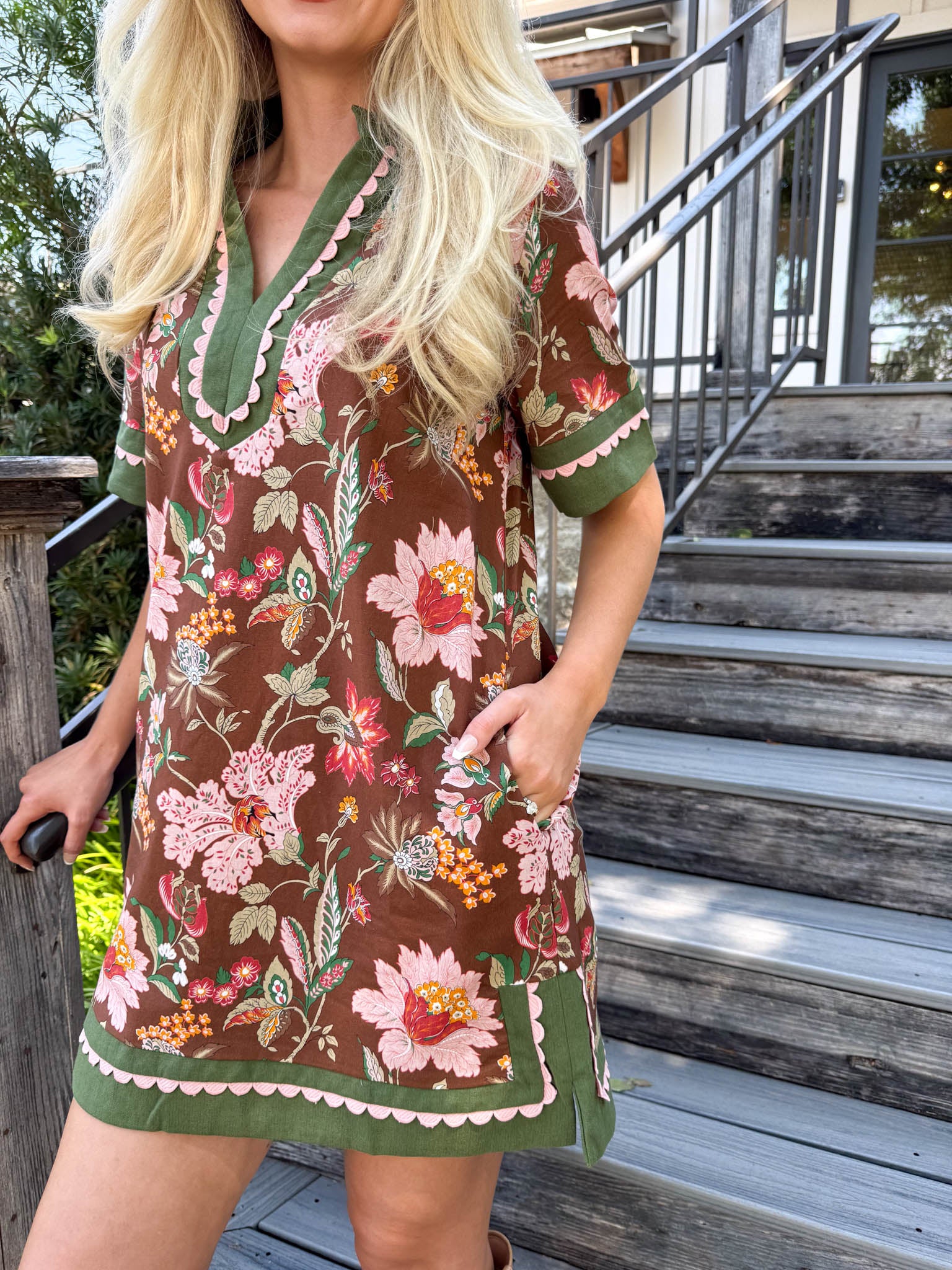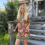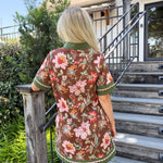 - Flattering a-line fit with a fun mix of brown, green, and pink florals for a fresh, vibrant look