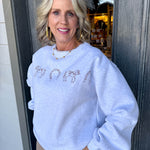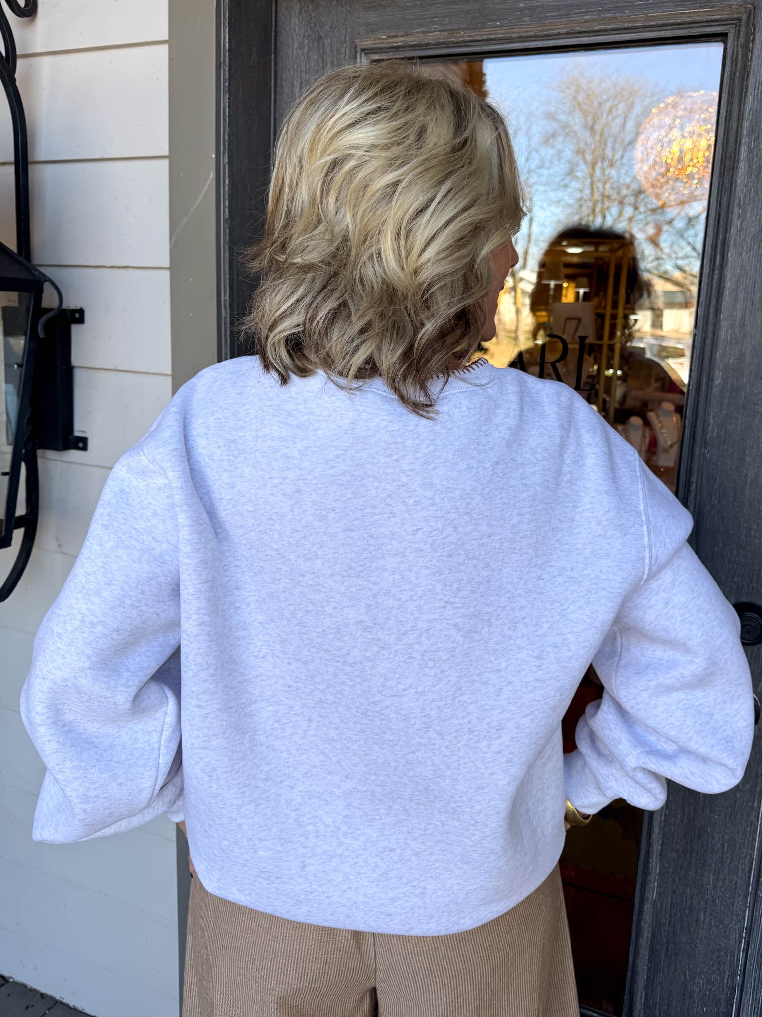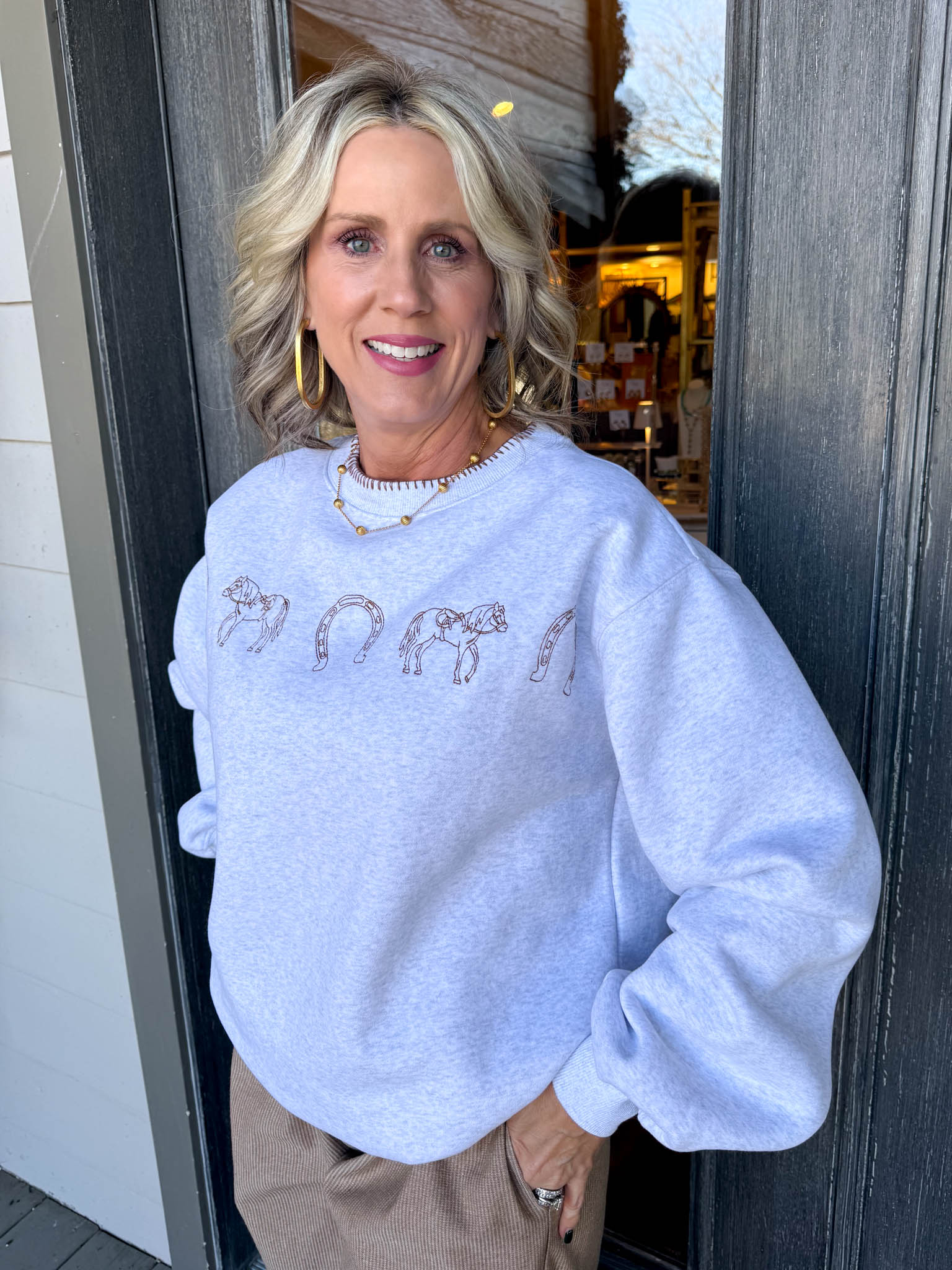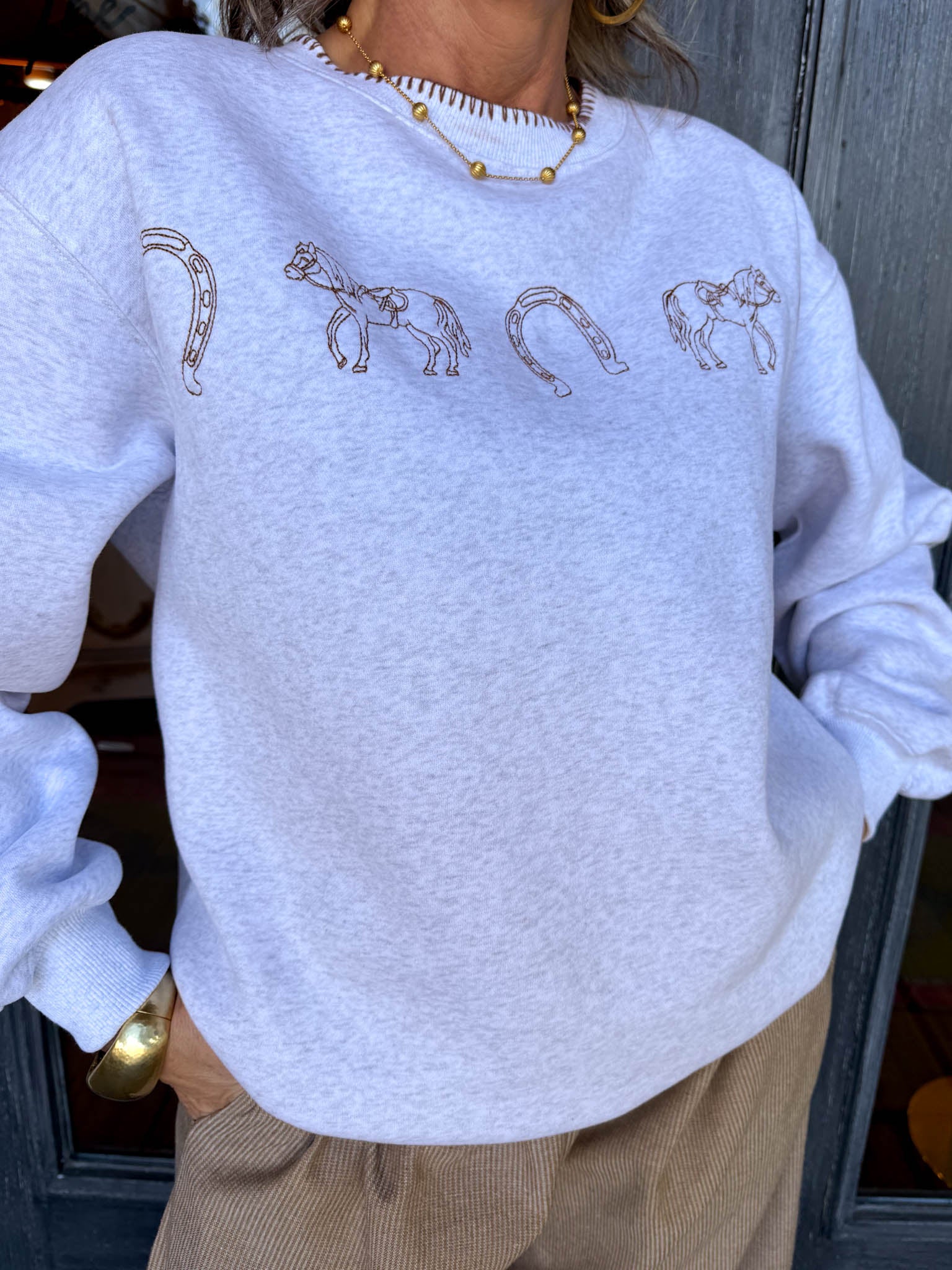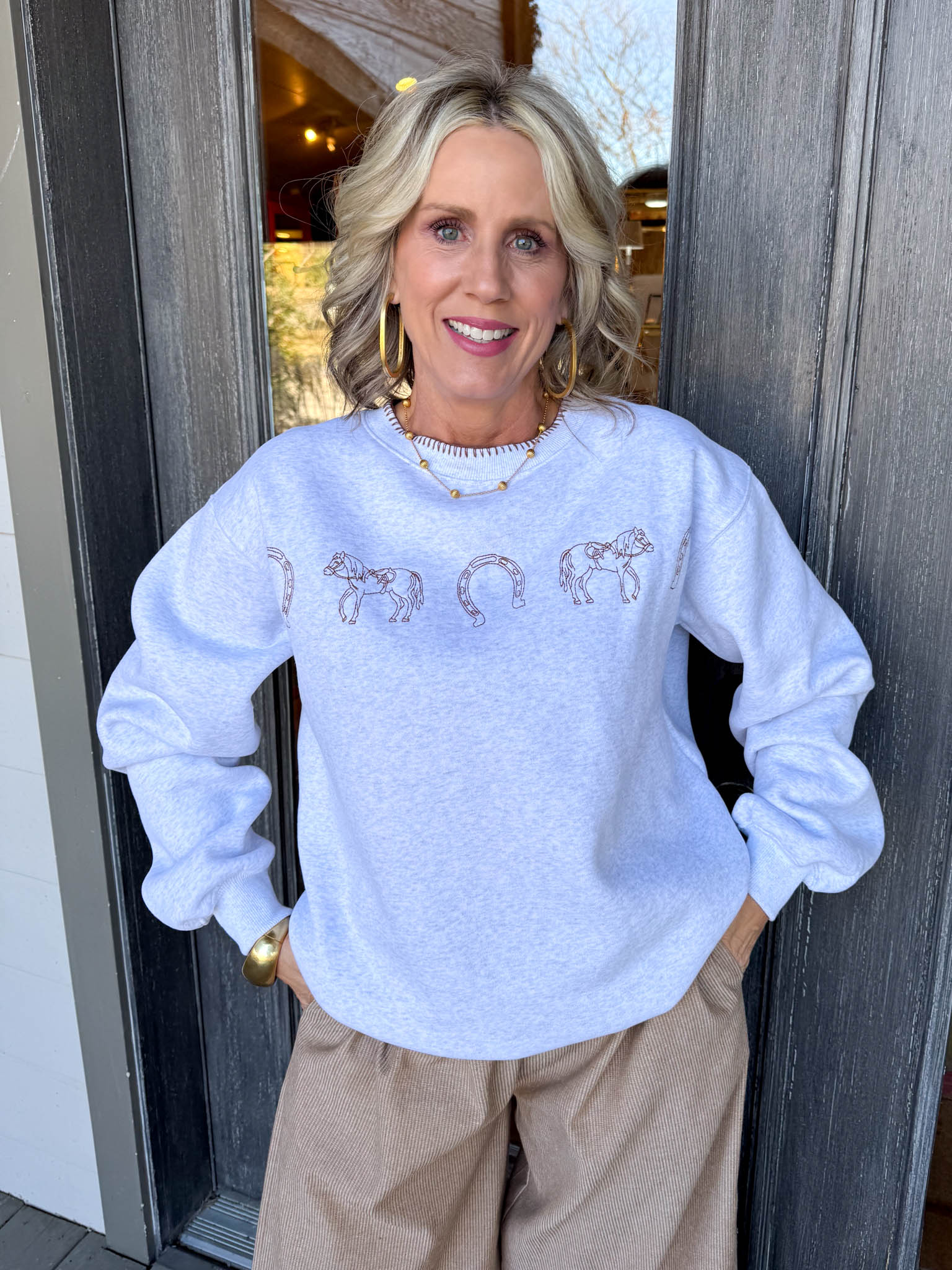 Western Flair Sweatshirt Saddle up in cozy comfort with this heather grey pullover that brings ranch-ready style to your everyday wardrobe.