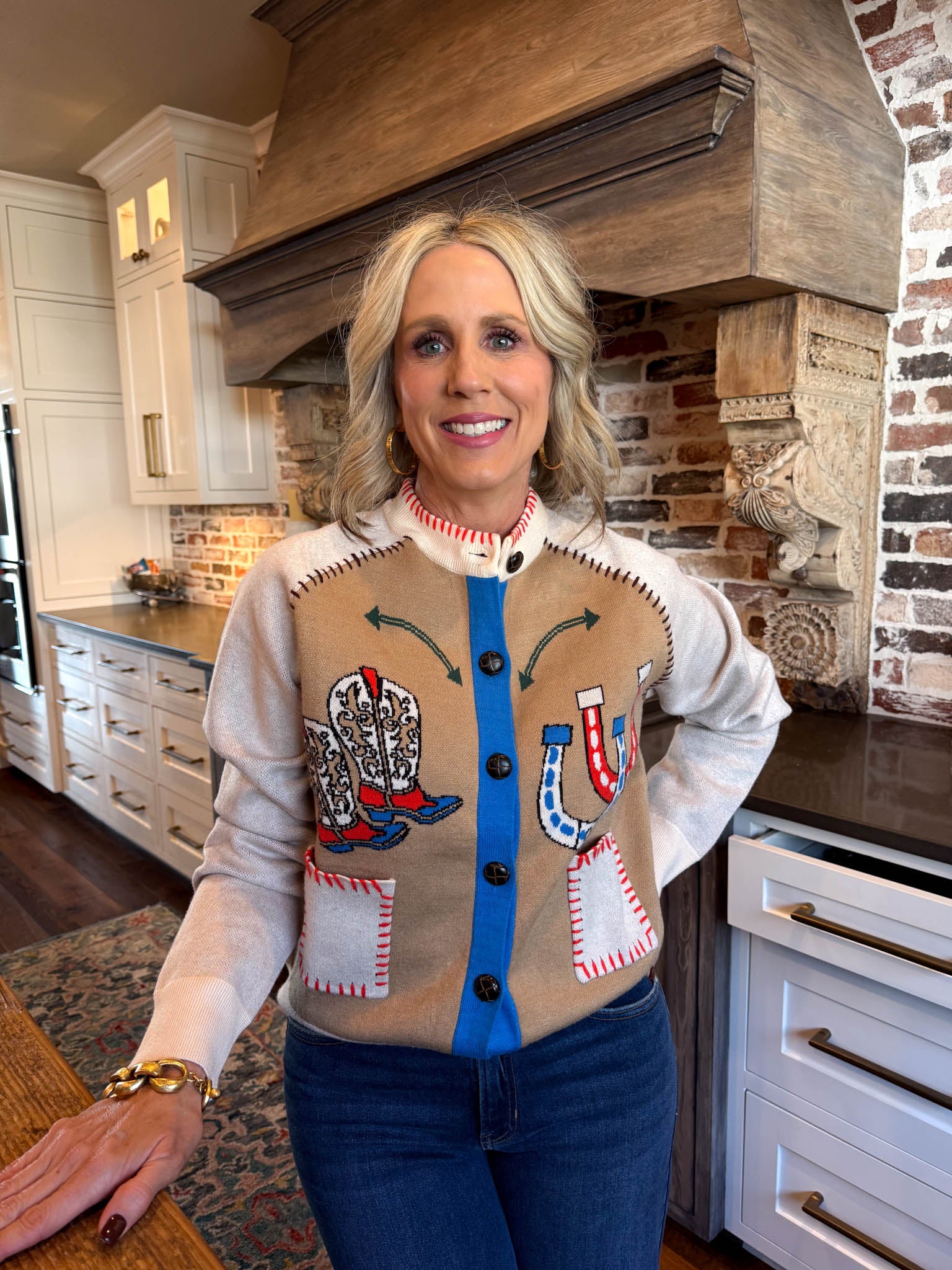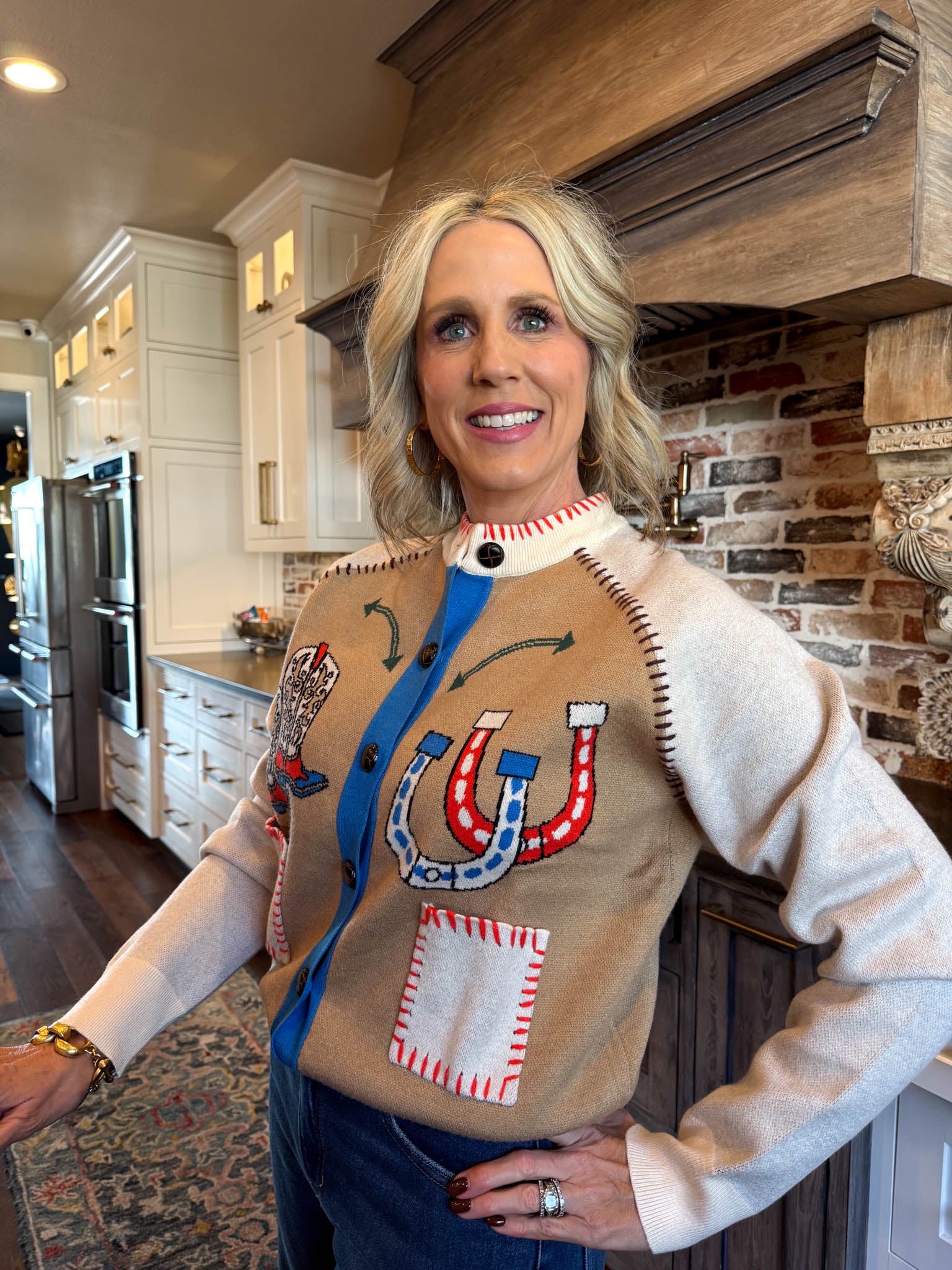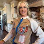 Saddle up in style with this cream cardigan that blends cowboy charm with refined elegance.