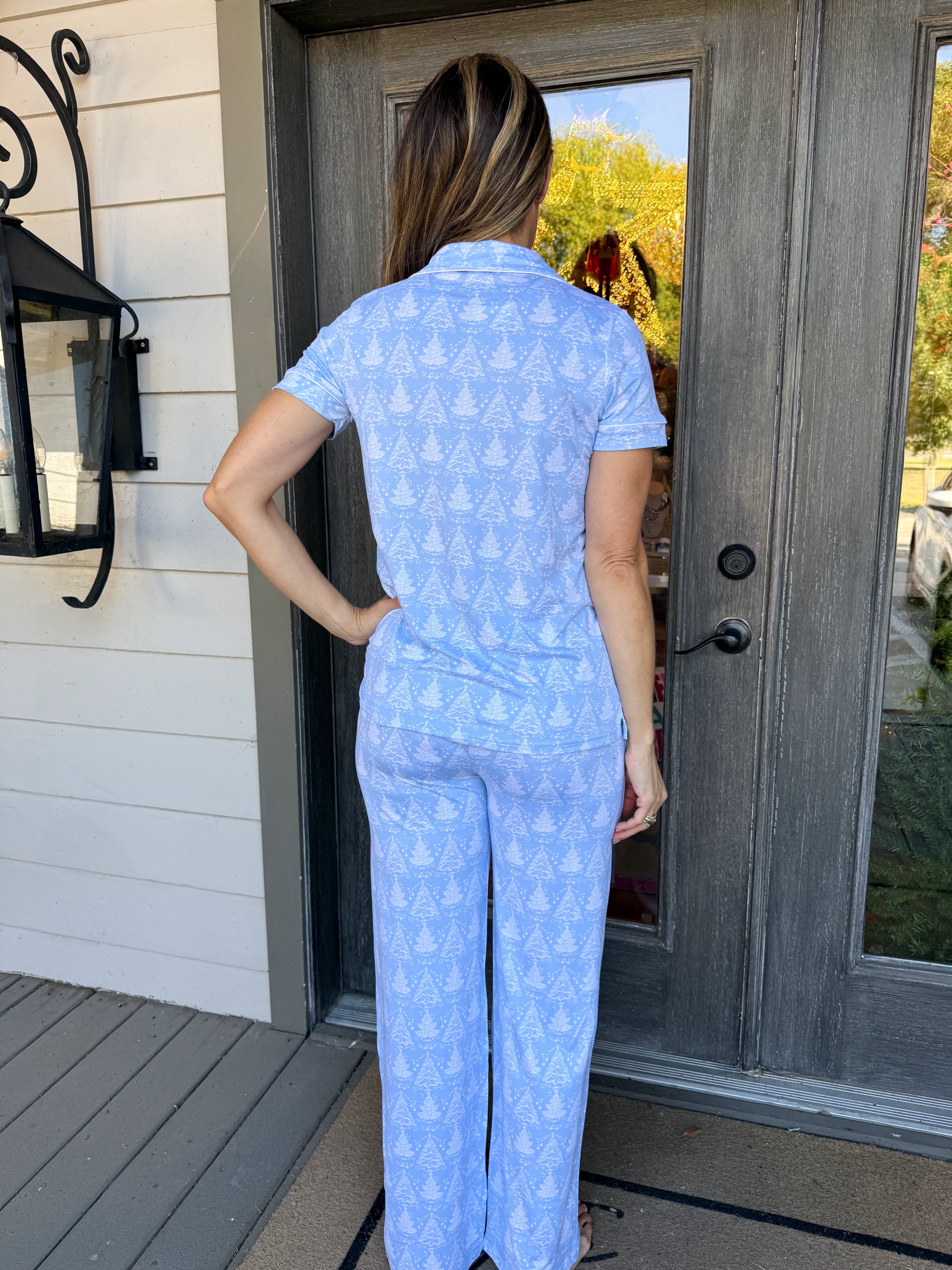 - Soft blue fabric featuring a charming white Christmas tree print for a seasonal vibe